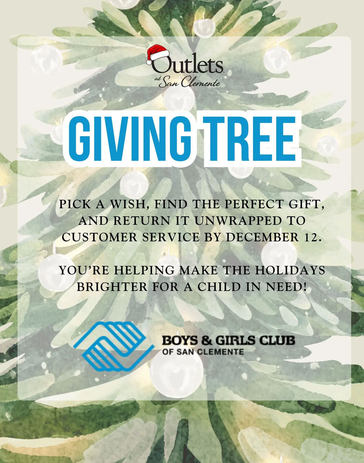 This holiday season, Outlets at San Clemente is your ultimate shopping and entertainment destination! While you're sleighing your holiday shopping list, stop by Customer Service and select a Christmas wish from the Giving Tree and support a child from Boys & Girls Club of San Clemente, or drop off a new unwrapped toy for Toys for Tots.